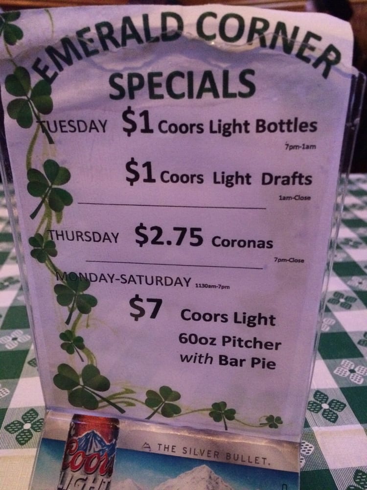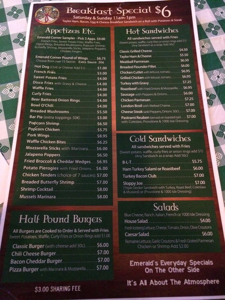 The atmosphere strikes a balance between divey charm and lively energy, with a jukebox, pool table, and numerous TVs showcasing games. Emerald Corner offers excellent service, with bartenders and servers known for their attentiveness.
